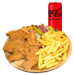 Bord met chicken strips, friet en salade met meerdere sauzen naar keuze + drank
